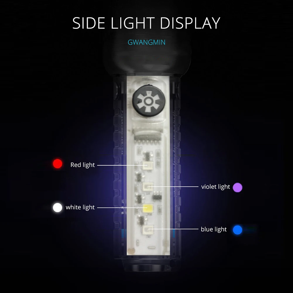 Feature: 1. Zoomable Focus: Adjustable beam distance and brightness (up to 250LM), this flashlight can be used as a working light or for night-time car repairs. 2. Ultraviolet Detector Light: The side light has ultraviolet detection function, which can be used for daily counterfeit detection or fluorescent agent inspection. 3. Type-C USB Charging: This flashlight features Type-C USB charging, making it more convenient to charge without any extra cables. 4. Night Glowing Shell: The shell features a night glow function that makes it easy to find the flashlight in the dark. The brightness of the glowing light depends on the intensity of the absorbed light during the daytime. 5. User-Friendly Switch Design: Long press the switch to turn the flashlight on/off. The flashlight will automatically shut off after 8 seconds of use in any mode. Specification: Main material: ABS+PC Product color: white Product size: approximately 95x29x29mm/3.74x1.14x1.14in Net weight of product: approximately 63.4g Lamp bead parameters: Bulb: Main light XHP50 white LED+side light white+red+blue LED Light color: white light+red light+blue light+purple light Gear: 6th gear: strong light - weak light - SOS - side lights purple light on - side lights red blue light flashing - side lights white light on Lumen: 250LM Other parameters: Battery: Built in 500mAh 14500 lithium-ion battery Charging method: Type-C USB charging Waterproof grade: IPX4 Zoom: Telescopic zoom