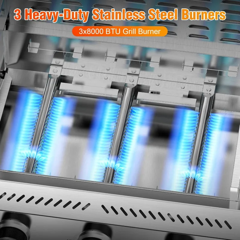 - Precise Temperature Control and Even Heating: This grill is equipped with powerful burners that ensure excellent heat distribution for even cooking. Our propane gas grill has 3 main burners (80,000 BTU each) for a total of 24,000 BTU stainless steel burners, each with its own control knob for a perfect grilling experience