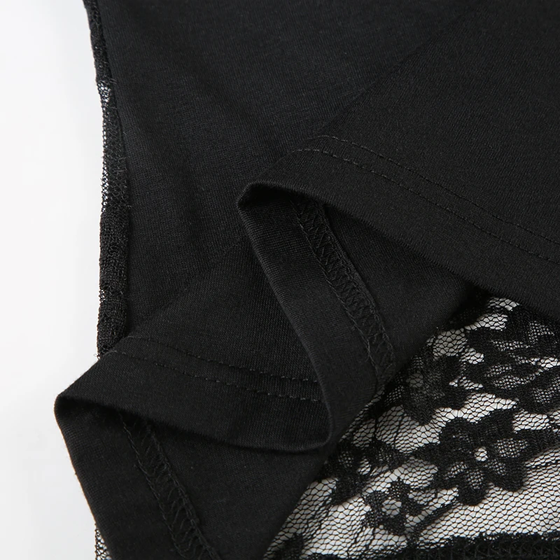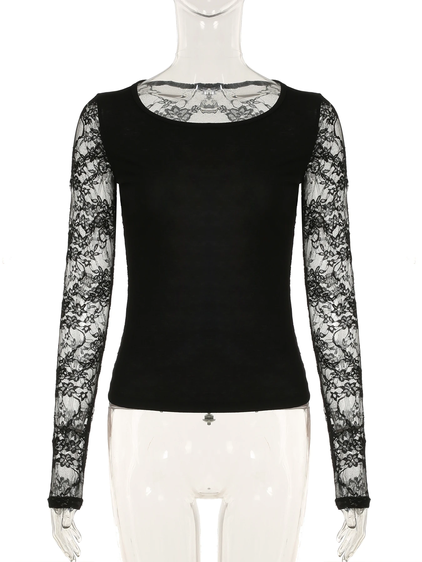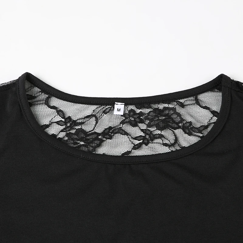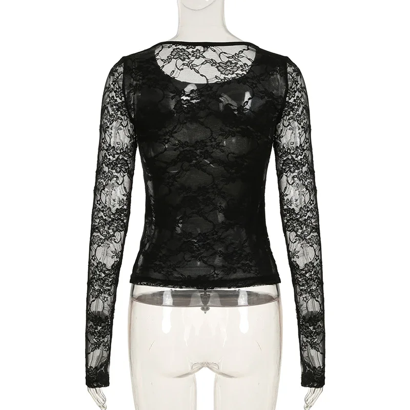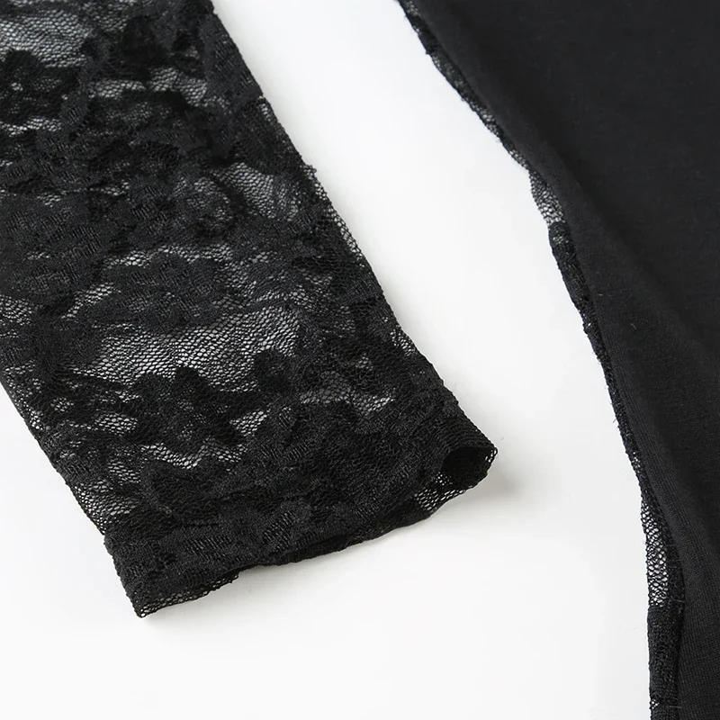 Black Gothic T-shirt For Women Sexy Club Lace Semi-see-through Long Sleeve Crop Tops Y2K Aesthetic 2000s Tee Autumn New