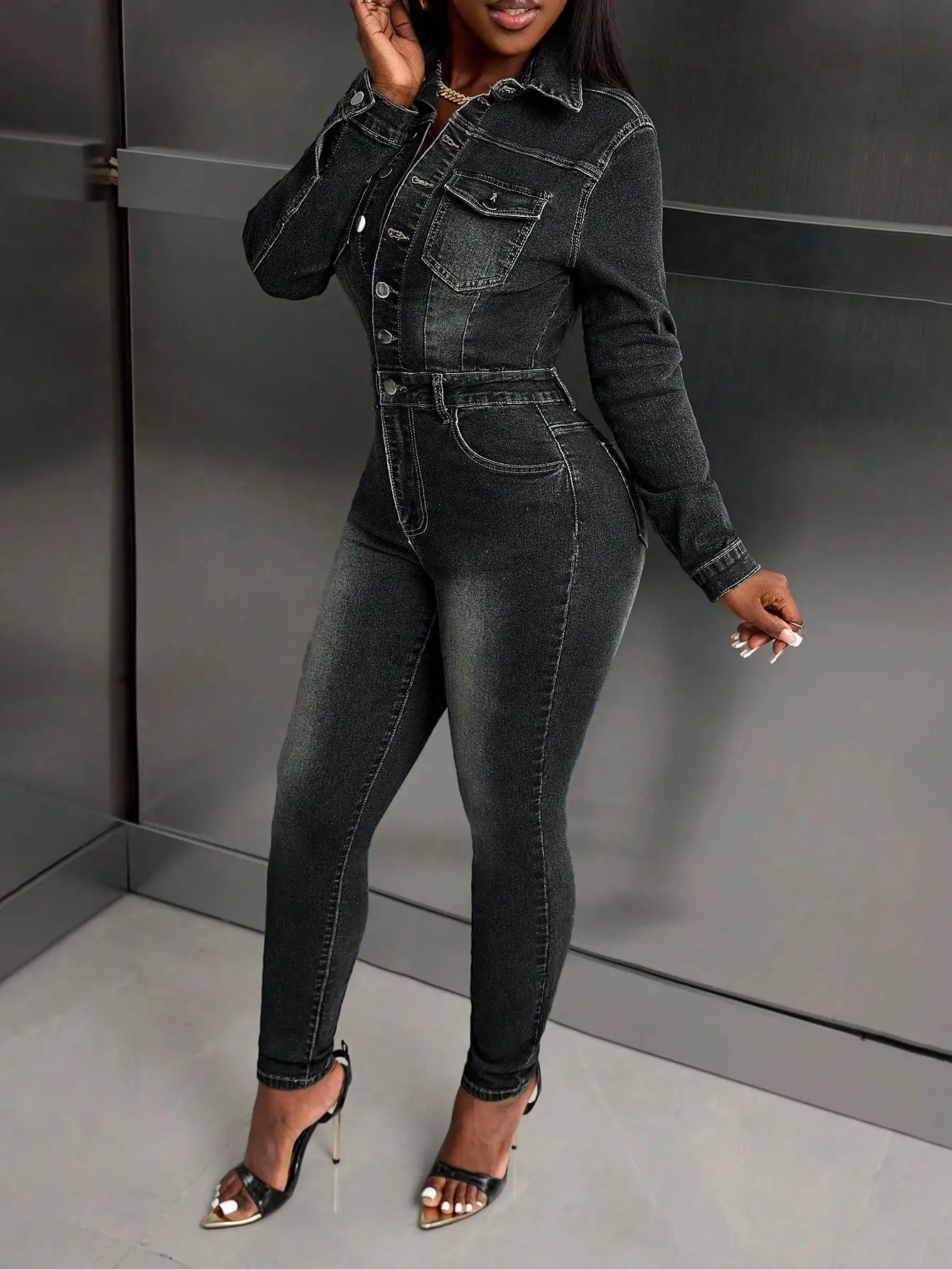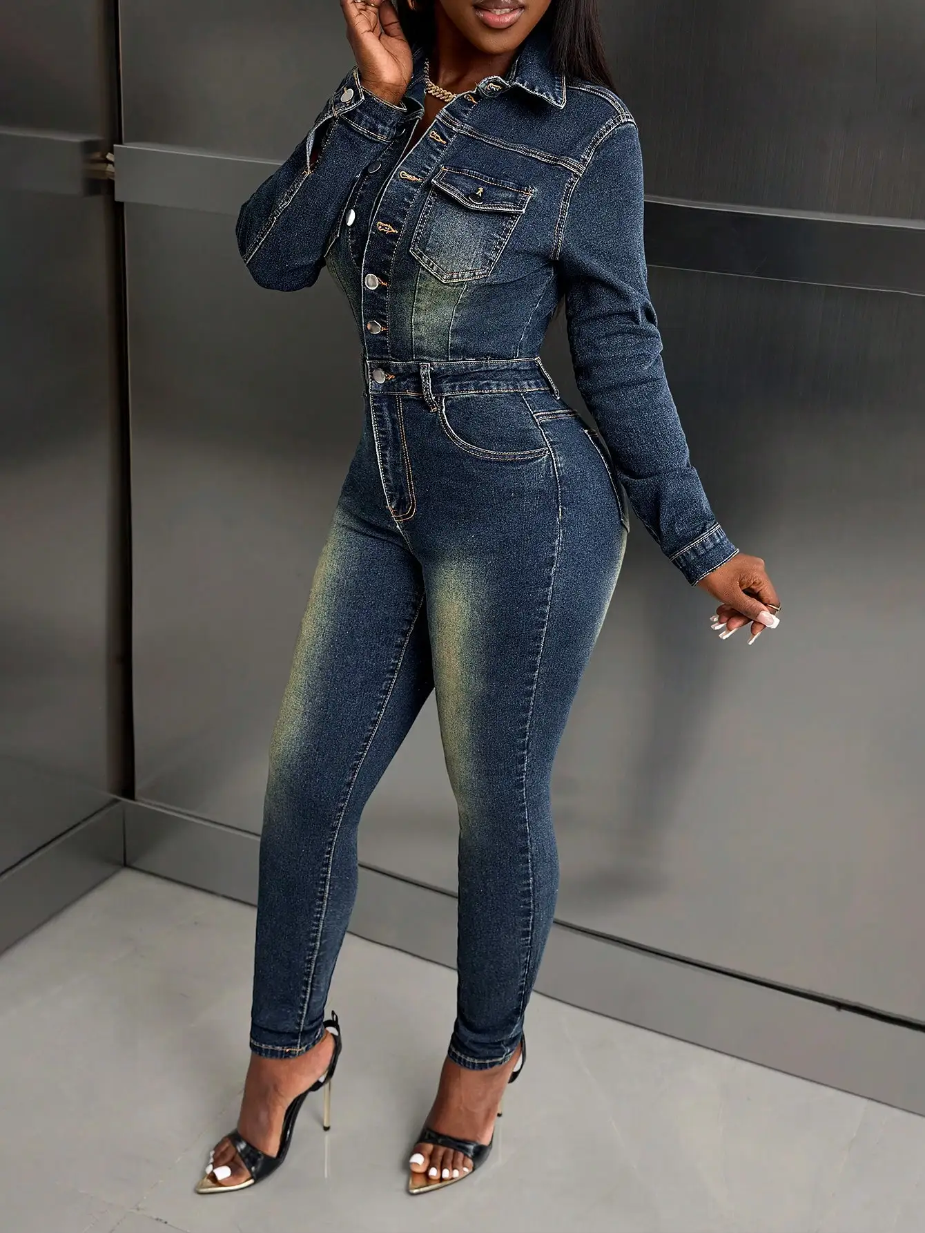 BWQ Retro Sexy Skinny Fit High-Waisted Washed Blue Denim Jumpsuit For Women, European & American Style, Autumn/Winter