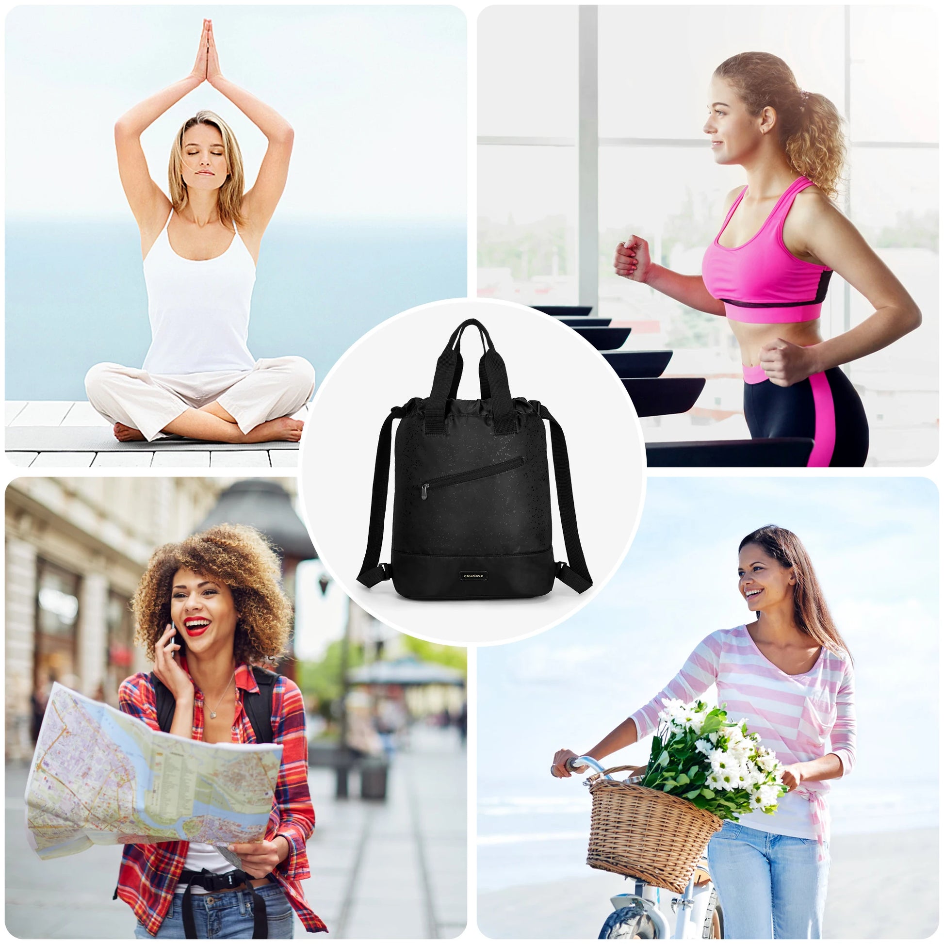 1. The perfect fitness bag: This bag can carry everything you need for exercising and working out! Store shoes, a pair of clothes, and a wallet inside, seal with a drawstring, and it also has a large inner sleeve for water bottles.