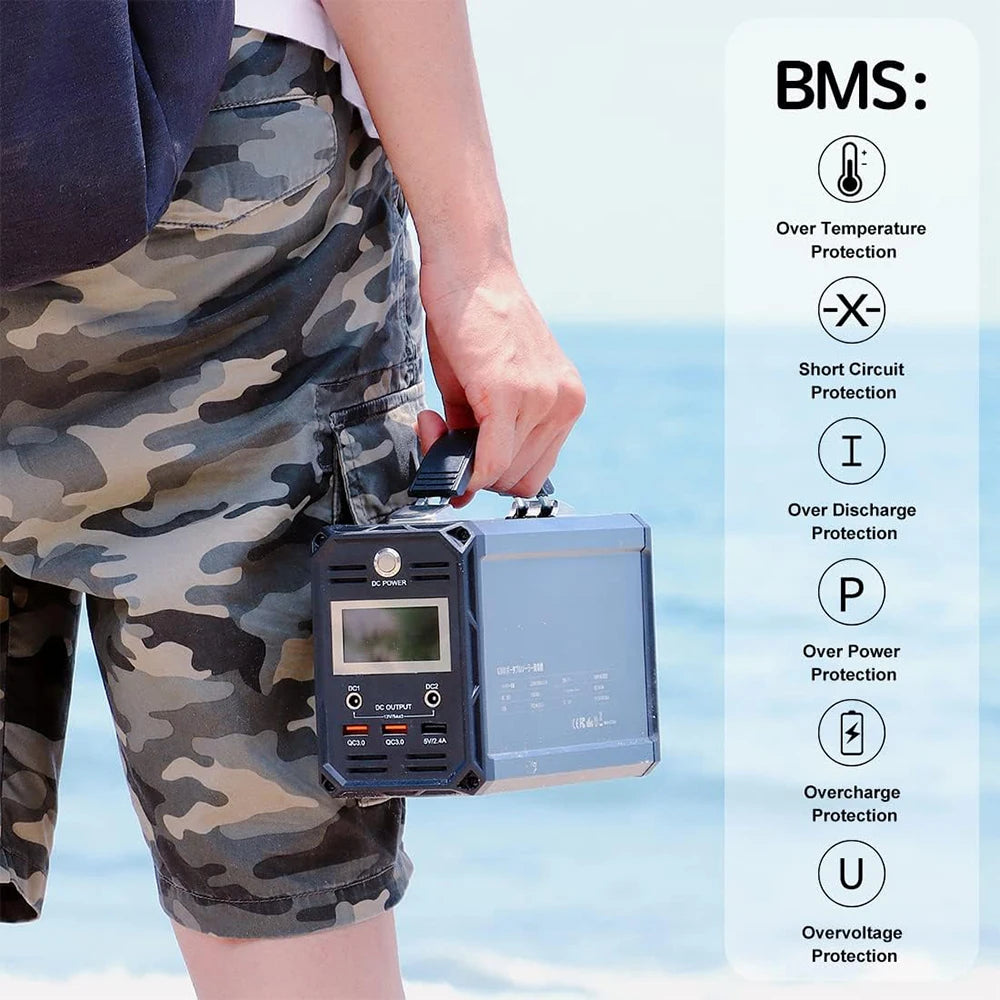 FLASHFISH portable power station (size: 9.84x3.34x5.12 inches, weight: 2.55KG), is equipped with 222Wh/60000mAh capacity, peak 350W, silent cooling fan to satisfy your outdoor needs.