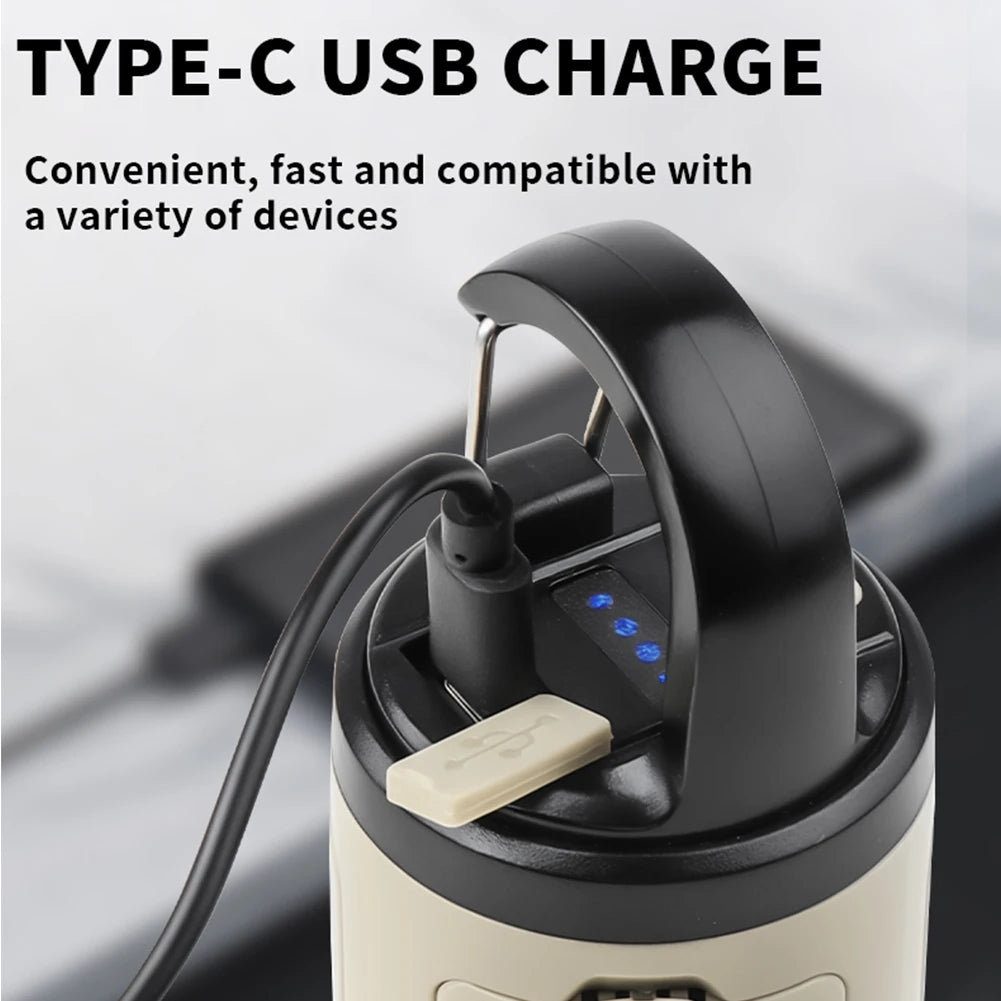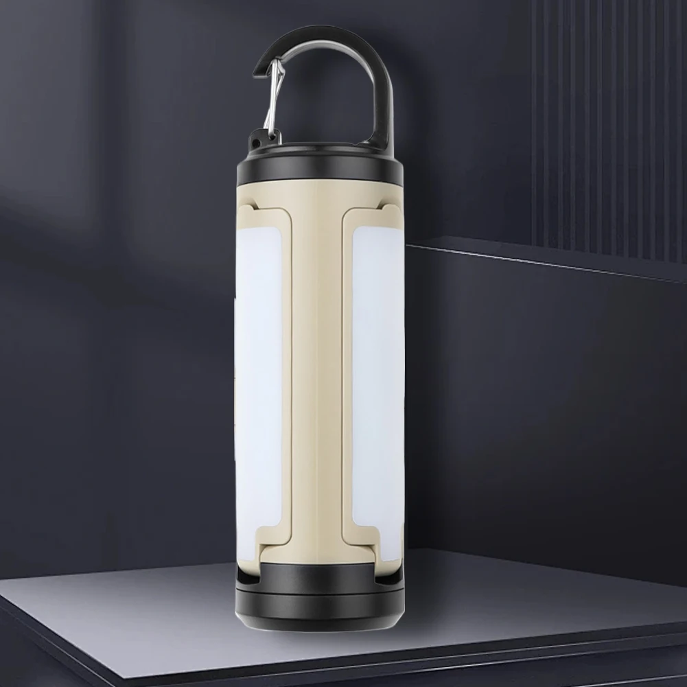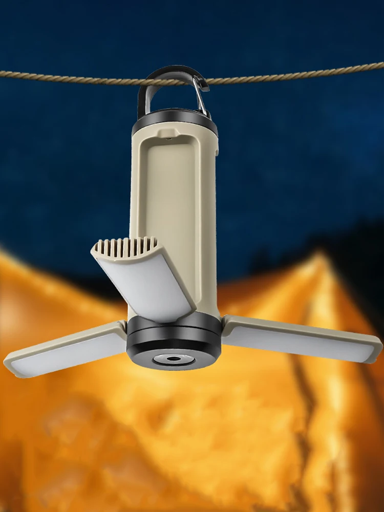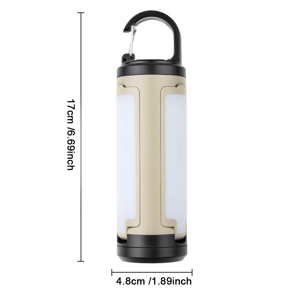 Features: 1.Multi-Color Lighting Options: Illuminate your space with the hanging camping lantern that offers a spectrum of vibrant colors. Perfect for creating the ideal ambiance, these customizable lights enhance any outdoor or indoor setting. 2.90° Expandable Blade Design: Featuring three collapsible blades, the rechargeable camping light provides efficient lighting coverage. Easily adjust the blades to achieve the desired lighting angle, ensuring optimal brightness in any scenario. 3.Versatile Functionality: This portable camping lamp serves as both a flashlight and a camping lantern. Whether trekking in the wilderness or setting up camp, its dual-purpose design meets your lighting needs effectively. 4.Battery Life Indicator: The camping tent lights feature a clear power display, keeping you informed of the remaining battery level. Enjoy uninterrupted illumination and plan your adventures without worrying about sudden power loss. 5.Hook and Handle Design: Equipped with a convenient hook and handle, the camping emergency flashlight can be easily hung or carried. Its portable design makes it effortless to transport and perfect for a variety of outdoor activities. Specification: Origin: Mainland China Bulb: 1xLED main light + 4x11 LED white light + 4x6 LED warm yellow light - 4x4 LED warm orange light Product size/net weight: 17cm (6.69in) x 4.8cm (1.89in) x 4.8cm (1.89in); 158G Material: ABS Switch: Press switch Battery: Built-in 1200mAh 18650 battery Charging method: Type-C USB charging 5V 0.6A Charging time/battery life Charging time: ≤3H Battery life: 3-7 hours Gear: Six gears: main light strong light - main light weak light - main light fast flash - 44xLED white light - 24xLED warm yellow light - 16xLED warm orange light, Press and hold any gear to shut down Lumen/range: 400lm 50m Indicator light 4 LED power indicator: 25%-50%-75%-100% LED blue light flashes when charging Note: Due to different monitor settings and lighting conditions, the actual color of the item may vary slightly from the pictures. Thanks for your understanding! Please allow a 1-2 cm difference in measurements due to manual measuring.
