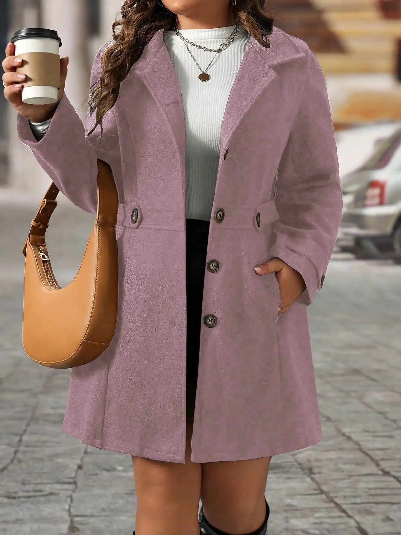 Plus Size Black Lapel Button Decor Waisted Mid-Length Knitted Coat For Women, Winter Fall Cloth For Women Autumn