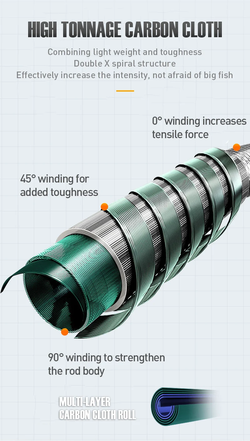 Combining light weight and toughness, double X spiral structure. Effectively increase the intensity, not afraid of big fish. Multi- layer carbon cloth roll. 0°winding increases tensile force. 45°winding for added toughness. 90°winding to strengthen the rod body.