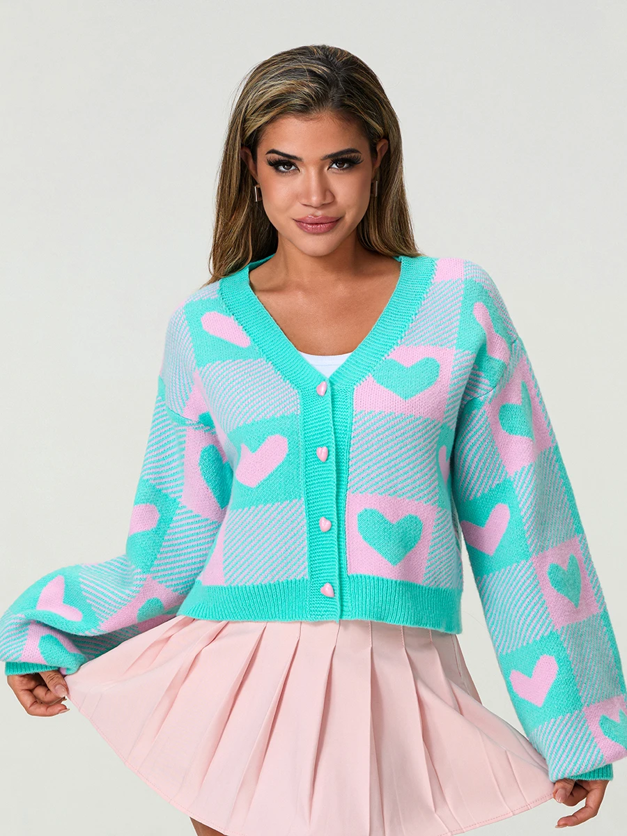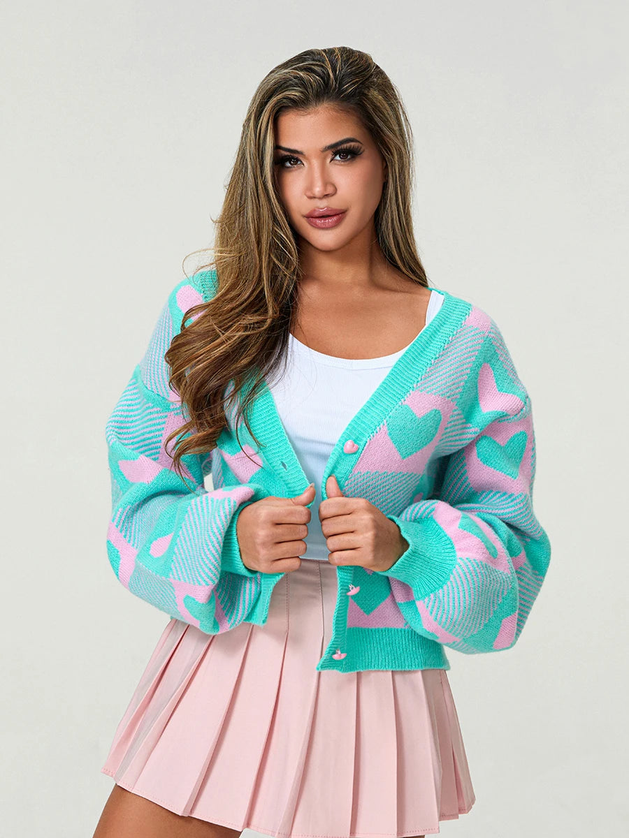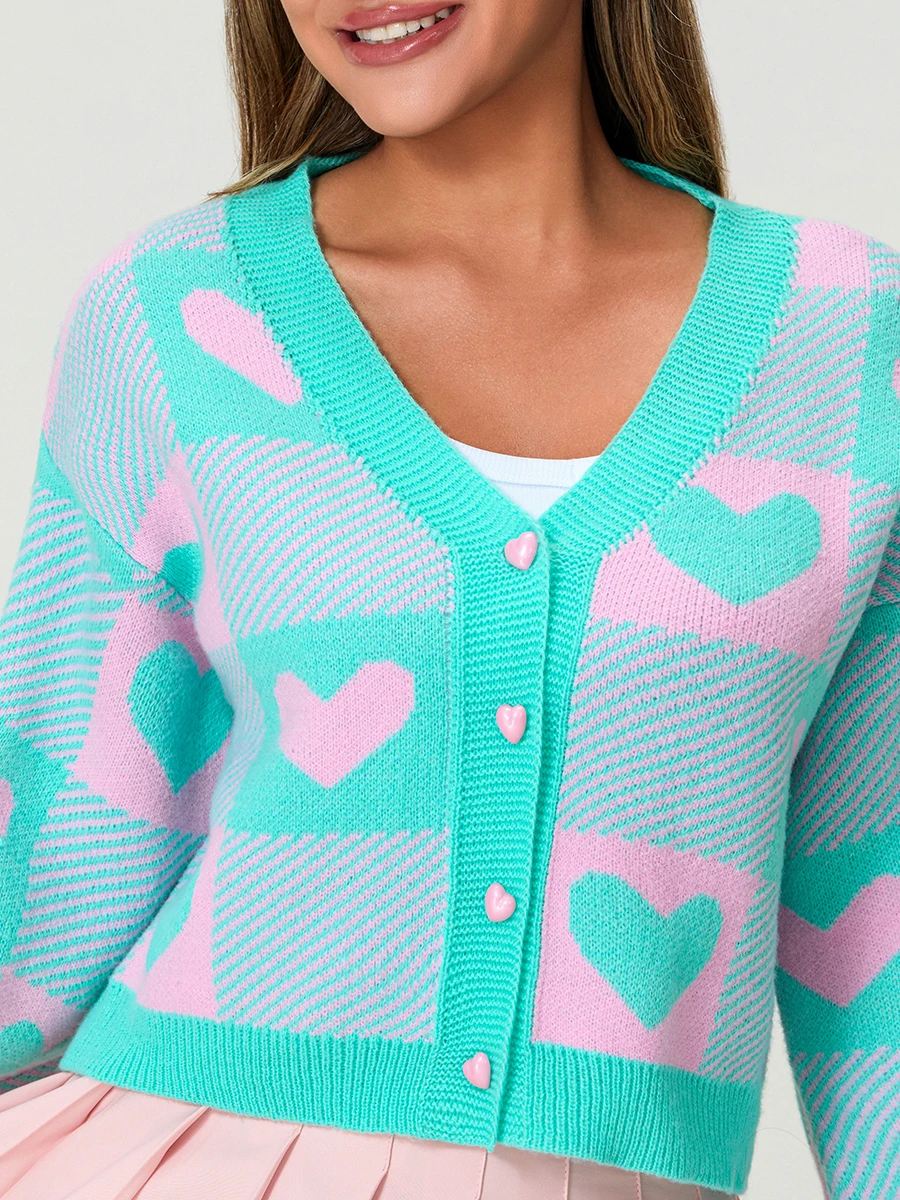 Valentine s Day Women s Heart Print Knit Sweater Cardigan with Long Sleeves V Neck and Button Up Detail