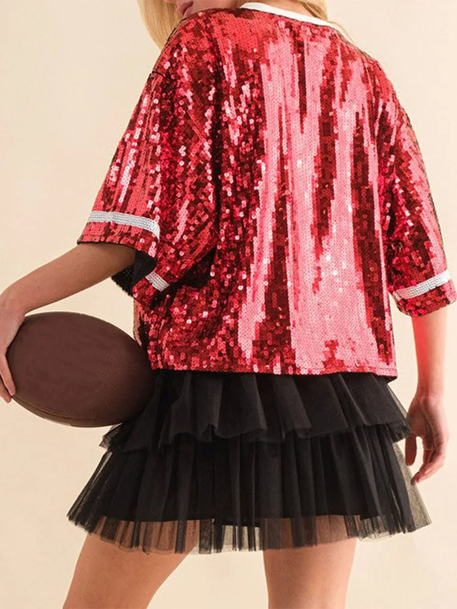 Womens Summer Fashion Sequins T-shirt Short Sleeve Crewneck Rugby Print Tops for Party